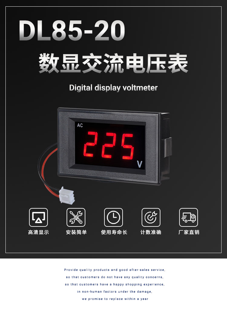 产品名称:交流电压表 产品屏幕:LED数码管 测量精度:1%±2个字 开孔尺寸:68*38MM 测量范围:AC80-500V